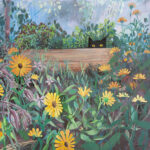Painting the undergrowth of my unruly garden was a fun challenge, I became hypnotised by the lines layers and negative space created by the plants and grass. I also became obsessed this year with Calendula because of its amazing medicinal qualities and fragrance.  Playing with the point of view of perspective – what am I?